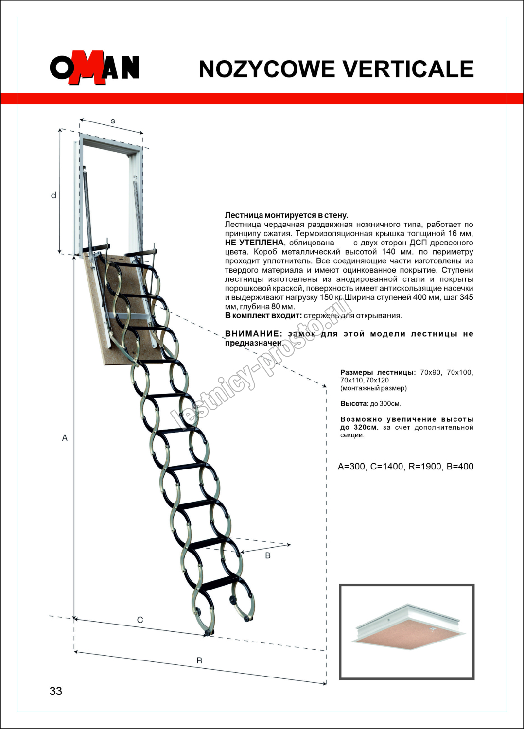 Чердачная лестница с люком OMAN NOZYCOWE VERTICALE 70х90 см, h-300 см