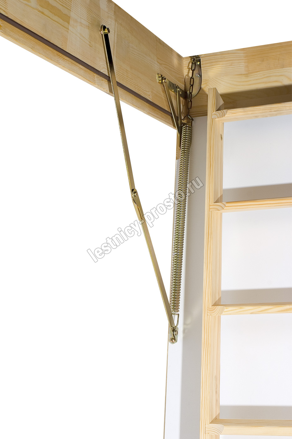 Чердачная лестница LTK Thermo изготовлена из сосны высшего качества и укомплектована утепленной крышкой люка толщиной 66 мм с повышенными теплоизоляционными свойствами. Данную модель лестницы можно использовать даже в домах, где значительна разница температур между этажами, и тем самым ограничить проникновение холода в жилые помещения. Лестница состоит из трех секций, которые компактно складываются и «хранятся в потолке». Крышка люка облицована ДВП белого цвета, что делает ее практически незаметной при установке в светлом или белом потолке. Для большего удобства и безопасности эксплуатации лестница Thermo оснащена боковым металлическим поручнем, а пластиковые наконечники предохраняют поверхность пола от повреждения и увеличивают устойчивость конструкции
