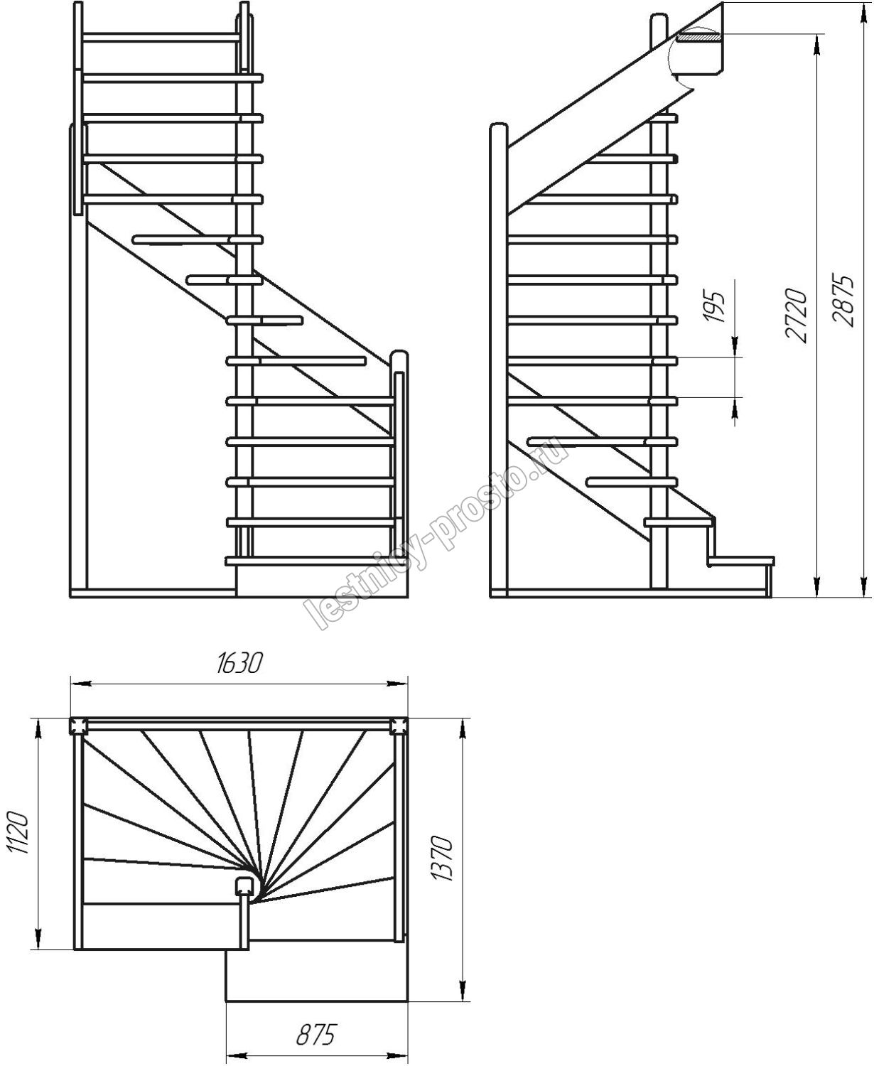 Деревянная межэтажная лестница ЛЕС-01 2720-2920 проем 1630-1120, Лиственница