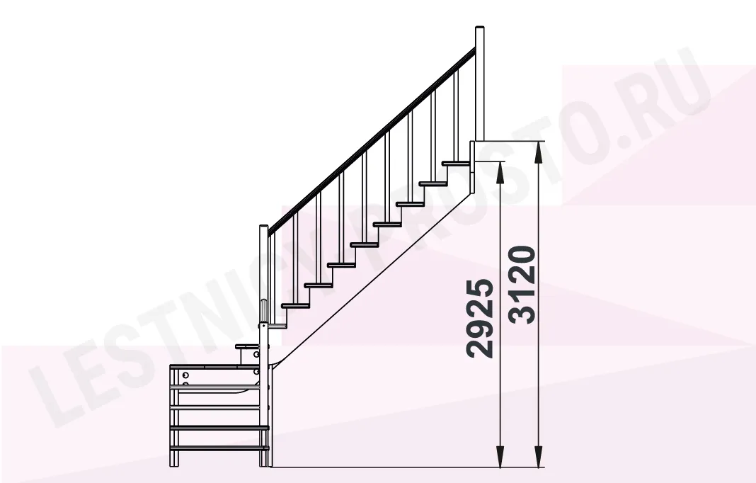 Ступени и поручень лестницы выполнены из дуба, остальные элементы из сосны. Возможно изготовление данной модели полностью из дуба. Базовый комплект включает в себя деревянные элементы лестницы и ограждения без какого-либо покрытия.
