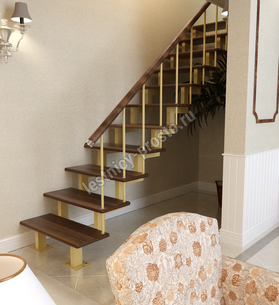 В основе конструкции прямой лестницы PROSTO Double усиленный каркас из профильной трубы 50×100 мм, представляющий собой 2 параллельных цельносварных косоура с двумя опорами на пол.