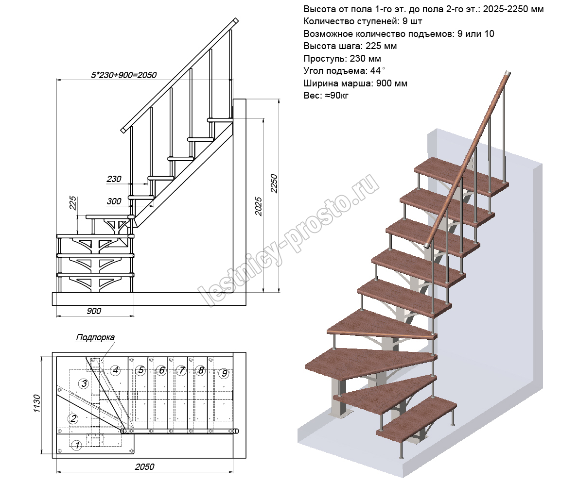 Лестница PROSTO MONO Г-образная h225 см, ступени лиственница