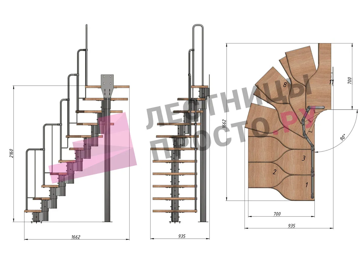 Лестница Prosto Urban Black гусиный шаг 700 мм, h198-288 см (11 ступеней), бук