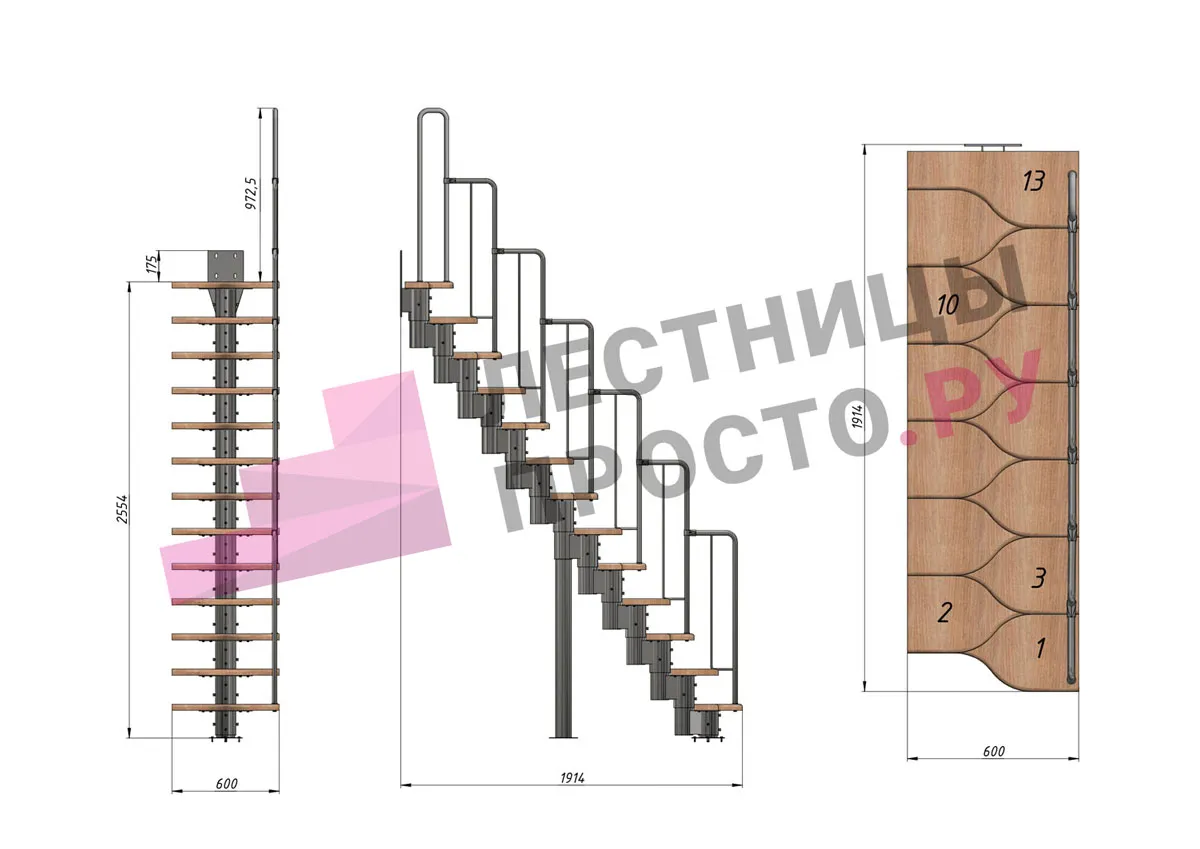 Лестница Prosto Urban Black гусиный шаг 600 мм, h234-336 см (13 ступеней), ясень