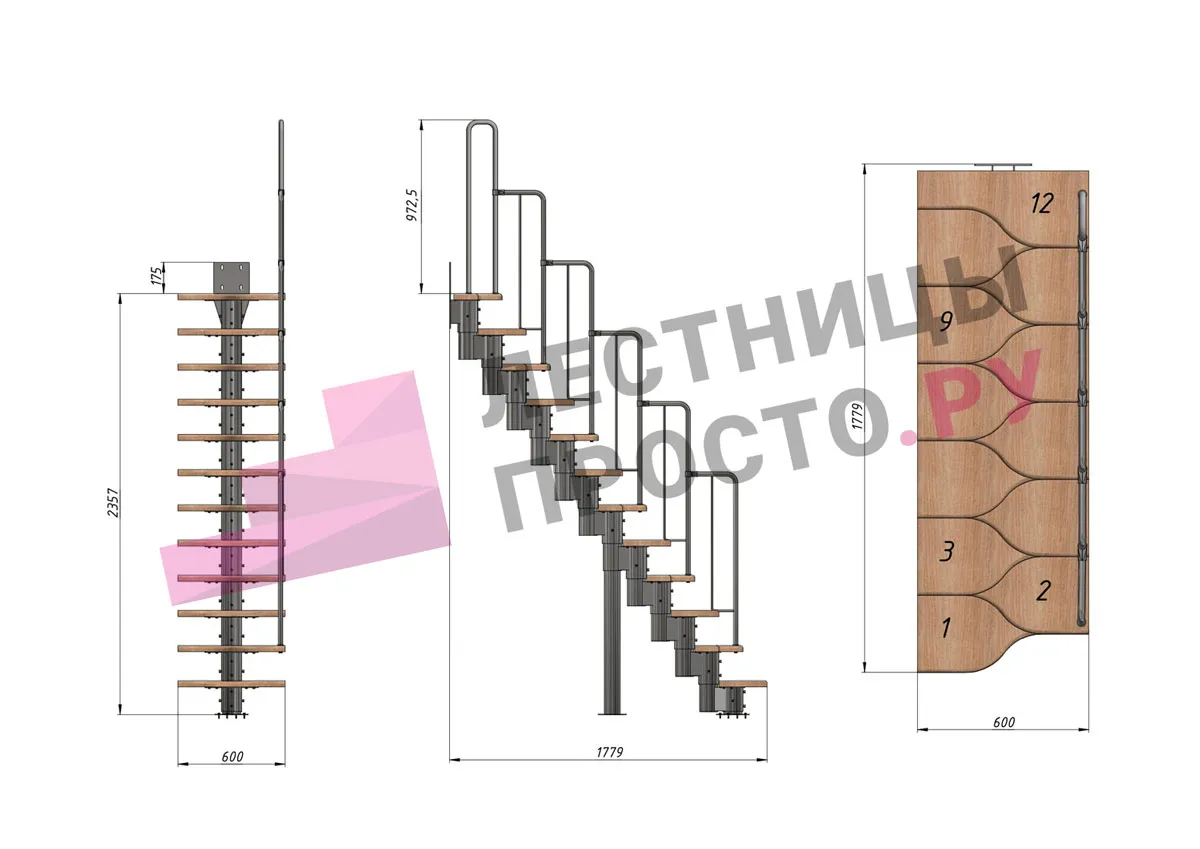 Высота лестницы 2160 - 3120 (12 ступеней) мм