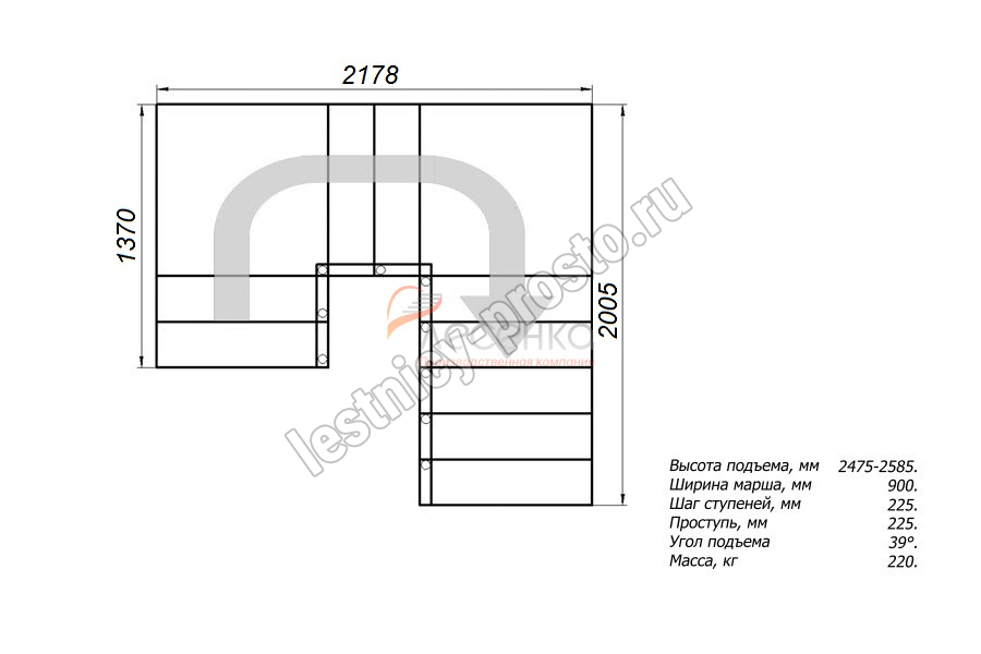 Модульная лестница Комфорт 225 2475-2585, Черный, Лиственница, Нержавеющая сталь