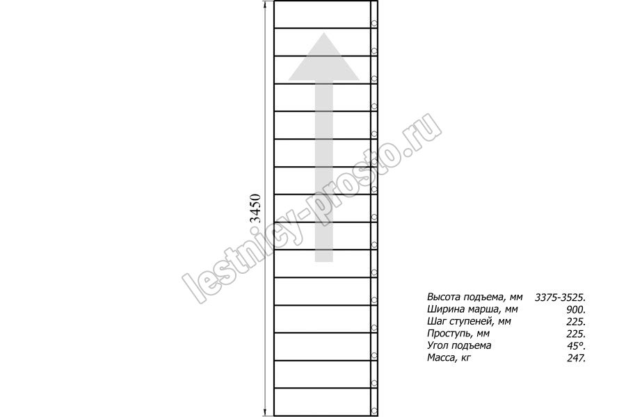 Модульная лестница Стандарт 3375-3525, Серый, Сосна, Нержавеющая сталь
