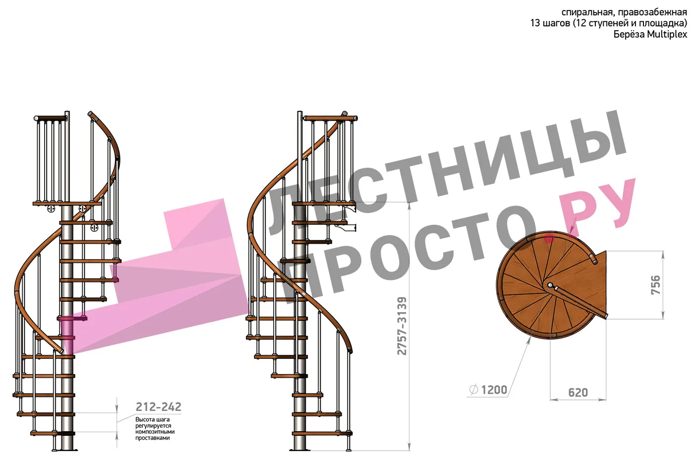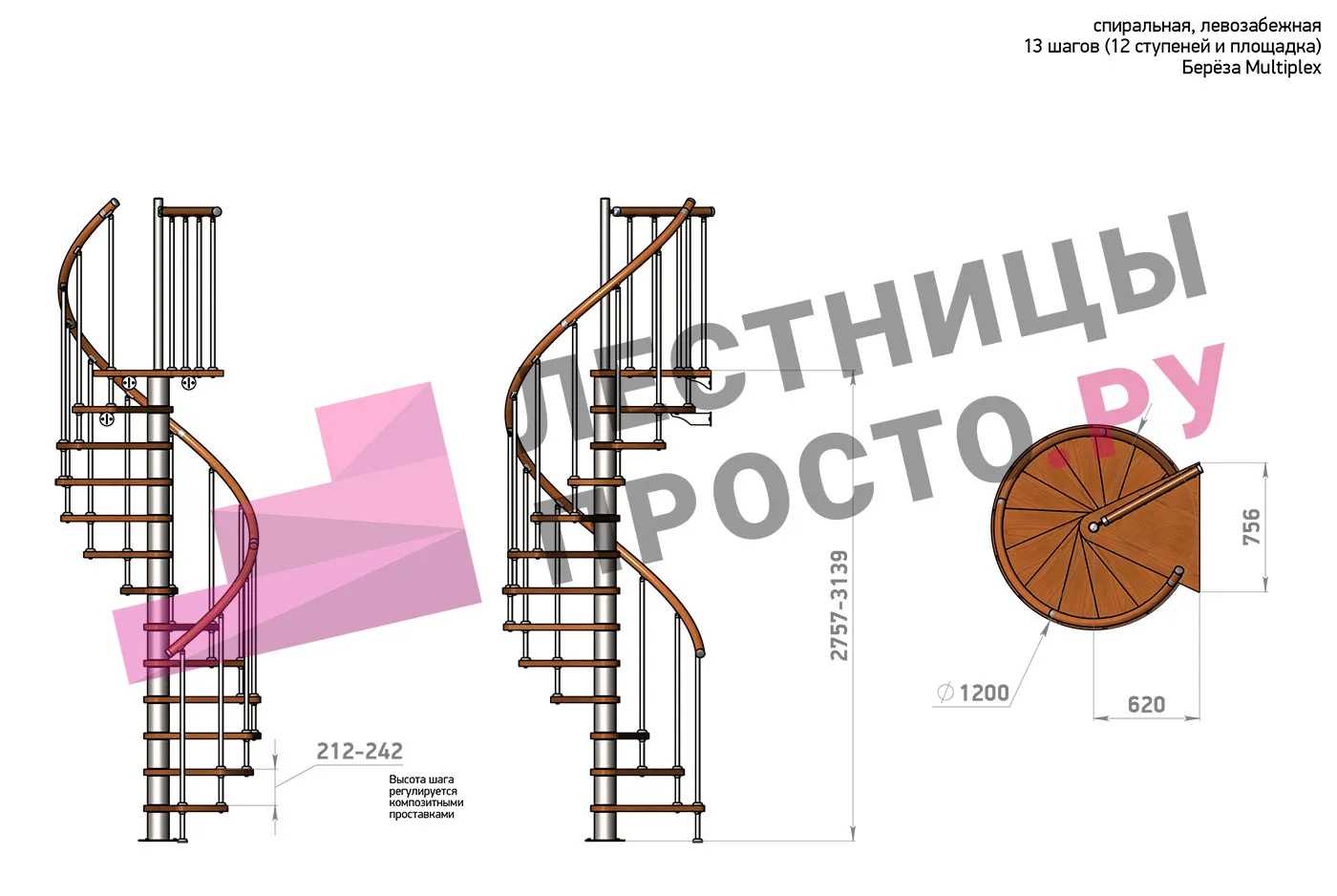 Высота ступеней регулируется с шагом 3 мм. в пределах 212-242 мм., благодаря чему, лестница прекрасно подгоняется под необходимую высоту.
