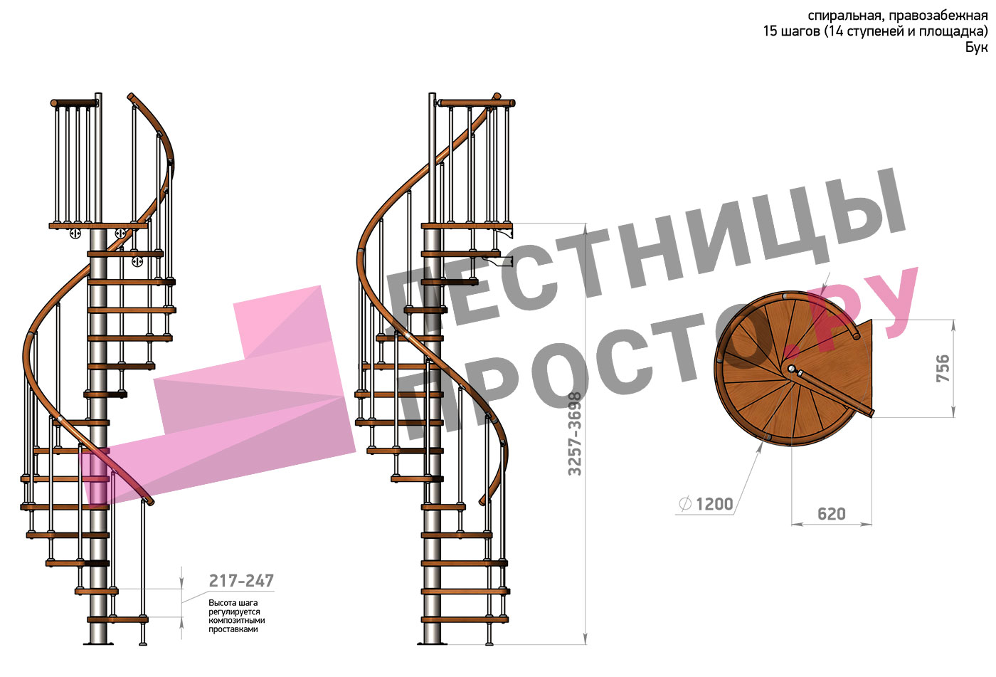 Винтовая лестница Prosto Spiral Black D120см, h325.7-369.8 см, бук
