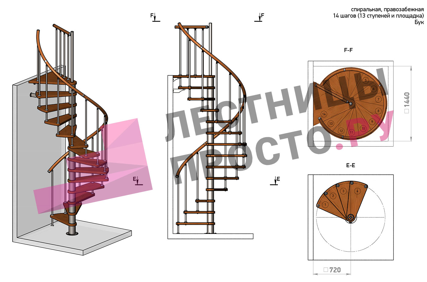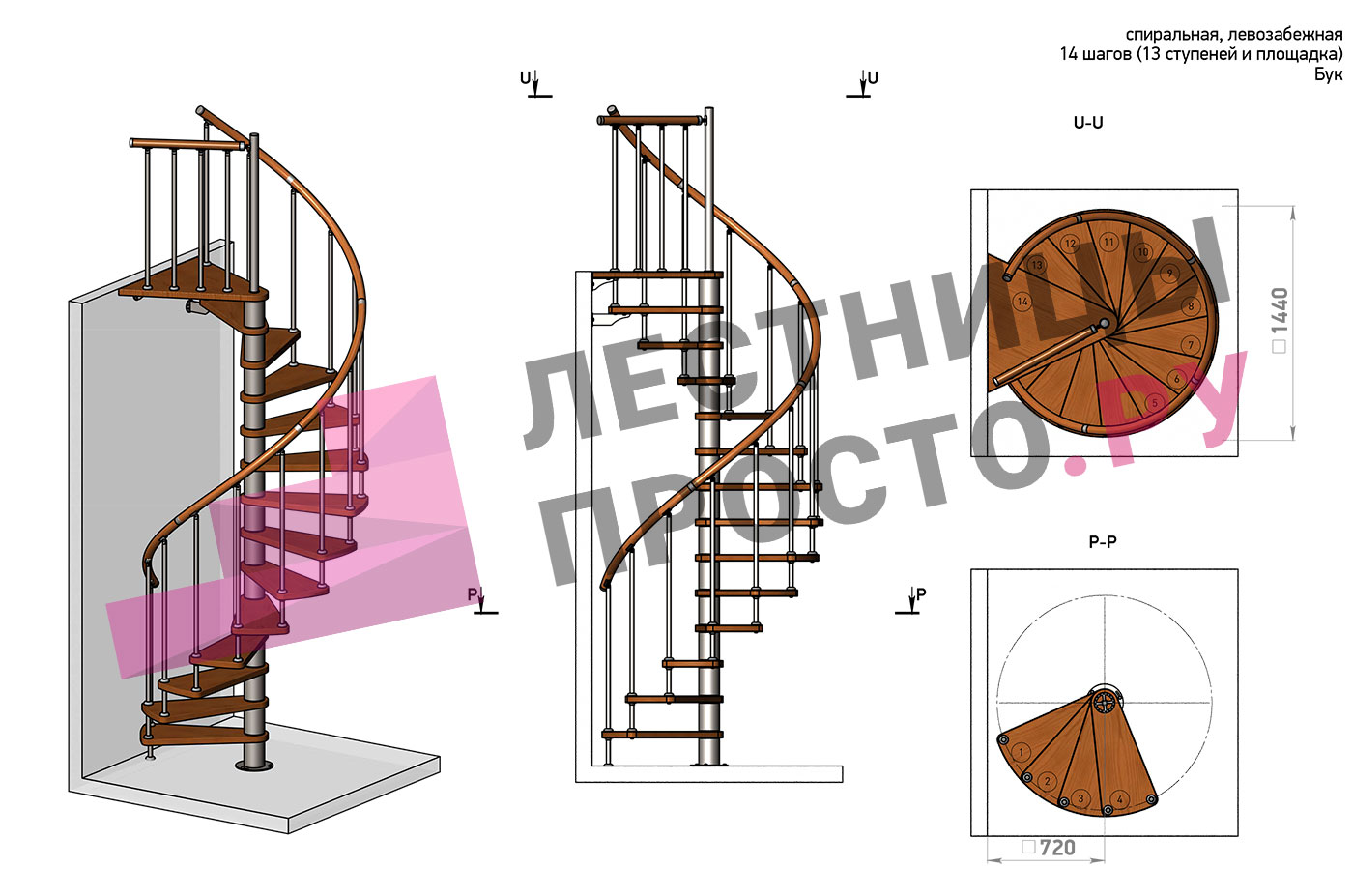 Винтовая лестница Prosto Spiral White D140см, h303.9-348,1 см, бук
